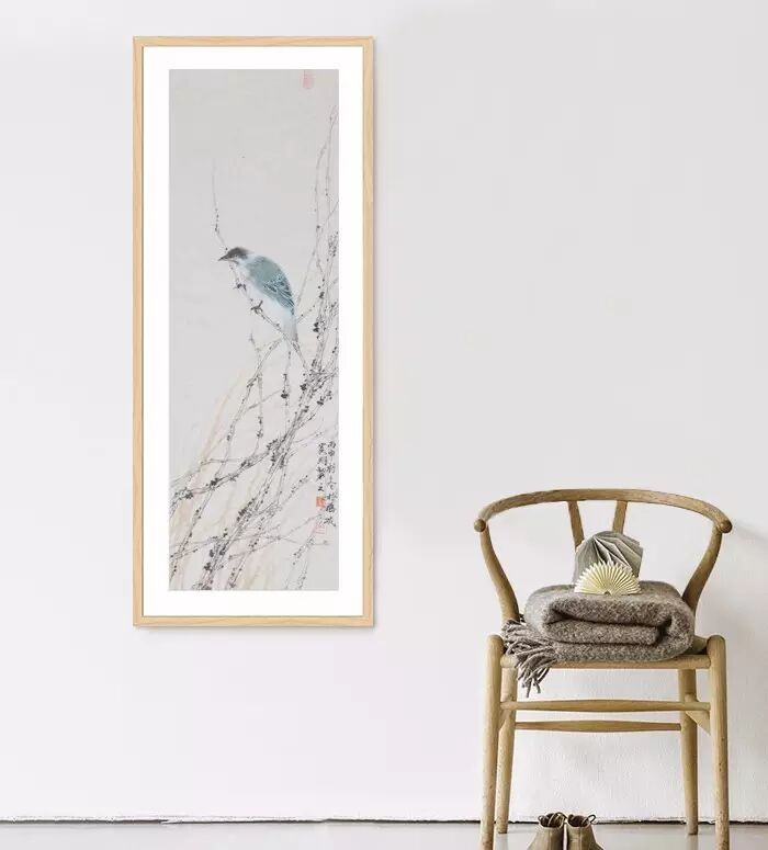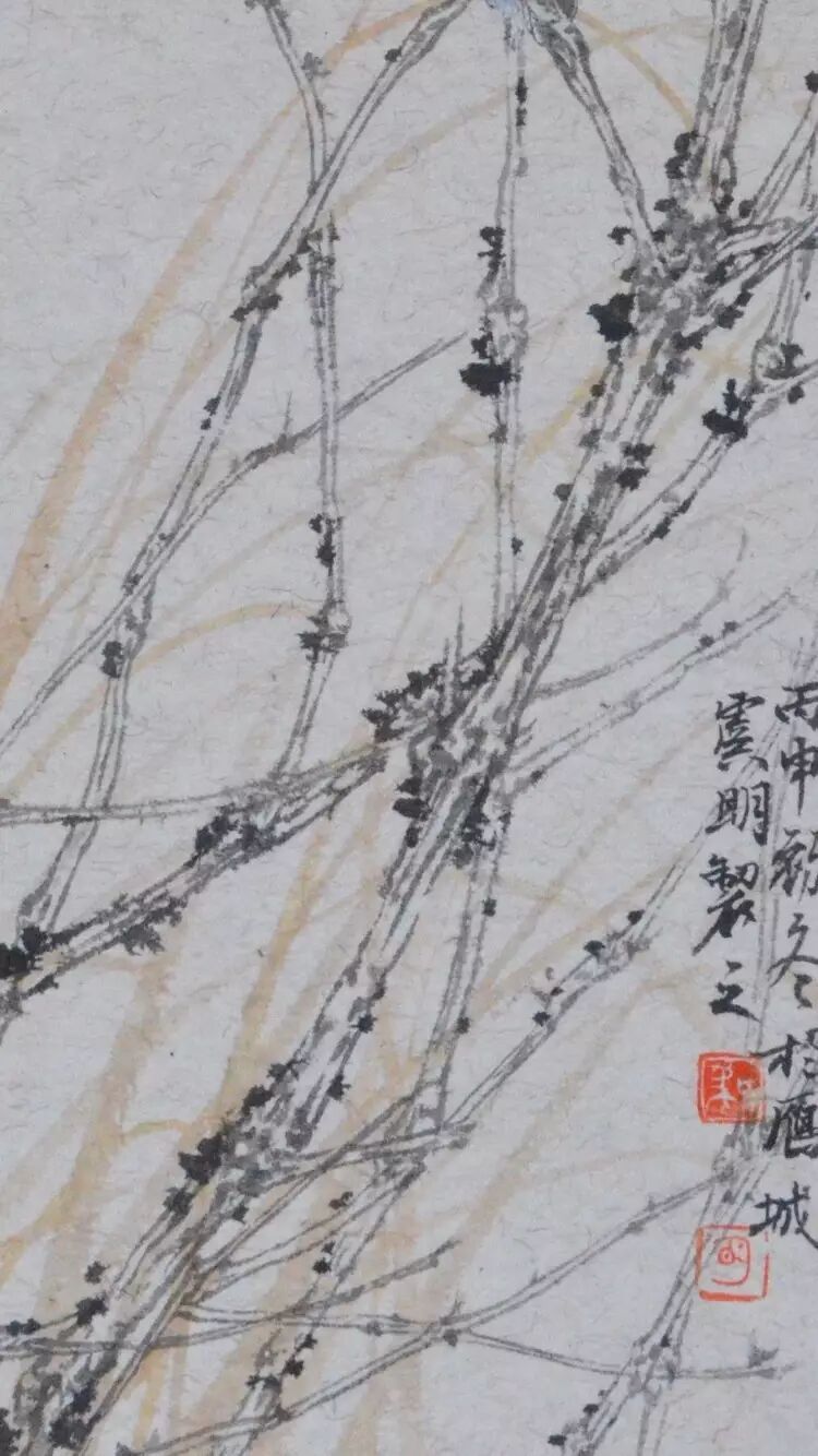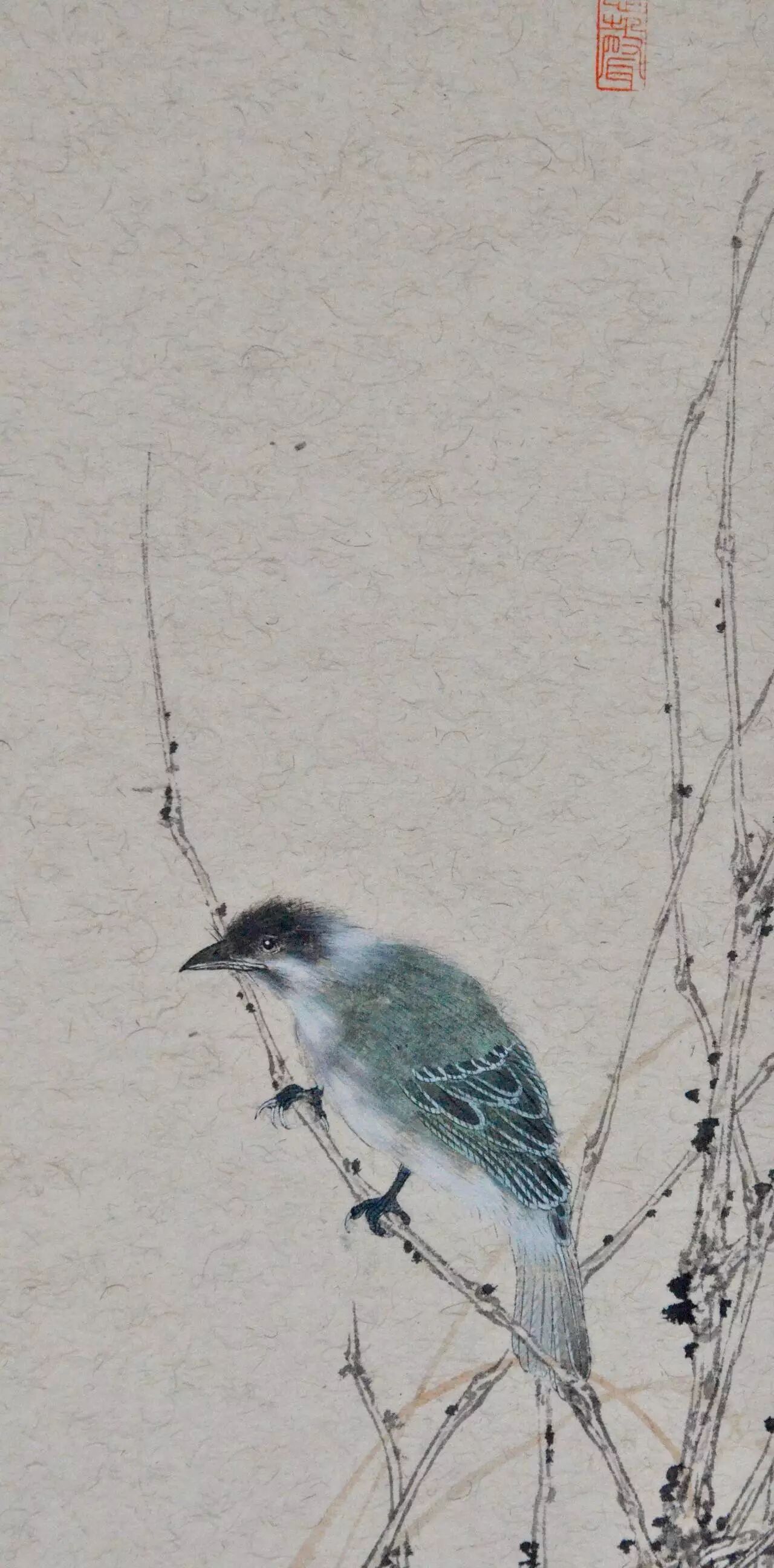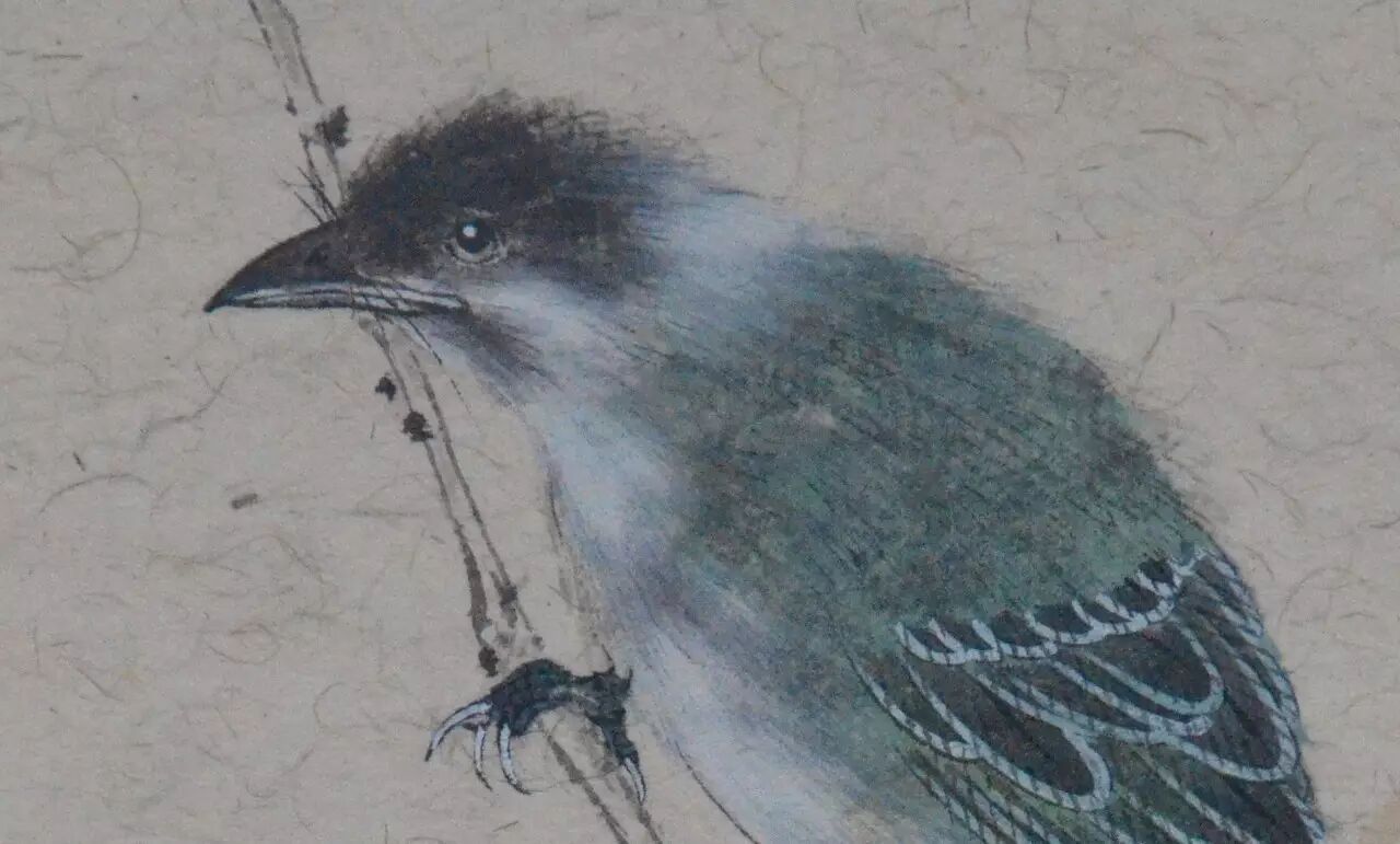 秋雨微寒,最先经受这种清寒的是草木之上停立的鸟雀。和现在的天气一样,雨水之后,清寒寂寂,长日无色,风起时可以听到鸟雀喧。虞明的画大多都很有精致的意味,但并没有工匠之气,你看到他画上的一草一木,鸟儿翩飞,扑扇着小小的翅膀,都是活灵活现的,是在无声的纸上世界里寂静地生动着的。这幅画上的鸟儿静静立在枯枝上,羽毛精细,色彩丰富而优美,尤其是清亮的眼神,瑟瑟雨中一粒星亮,将其神采勾画得形神毕肖。整幅画瘦长而将大部分的笔墨看似落在枝叶纸上,唯一一只毛色幽蓝的鸟儿只占据小小的一隅,却足以抓住每一位观者的眼睛,很是动人。“这是一只多美漂亮的鸟儿啊!”观者如此想着,如同这只美丽的鸟儿,虞明的绘画艺术亦是美丽的,有声有色的,是别具一格的动人世界。