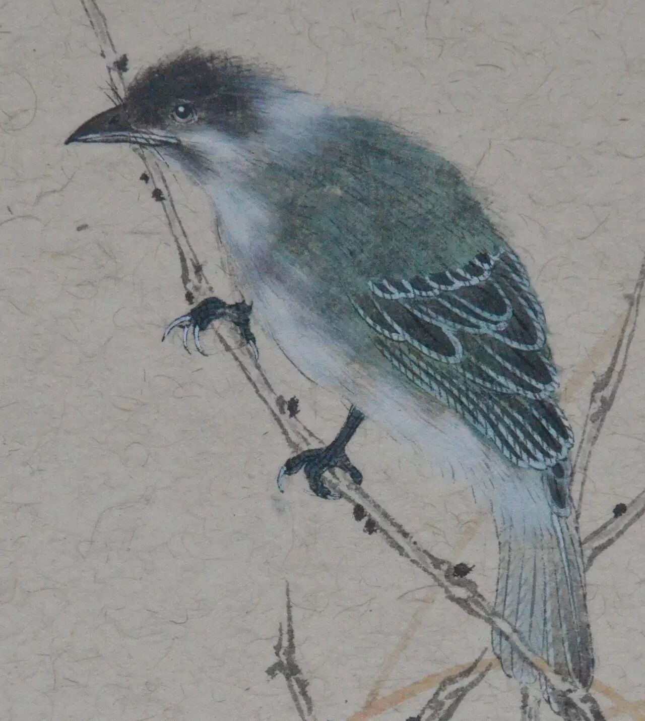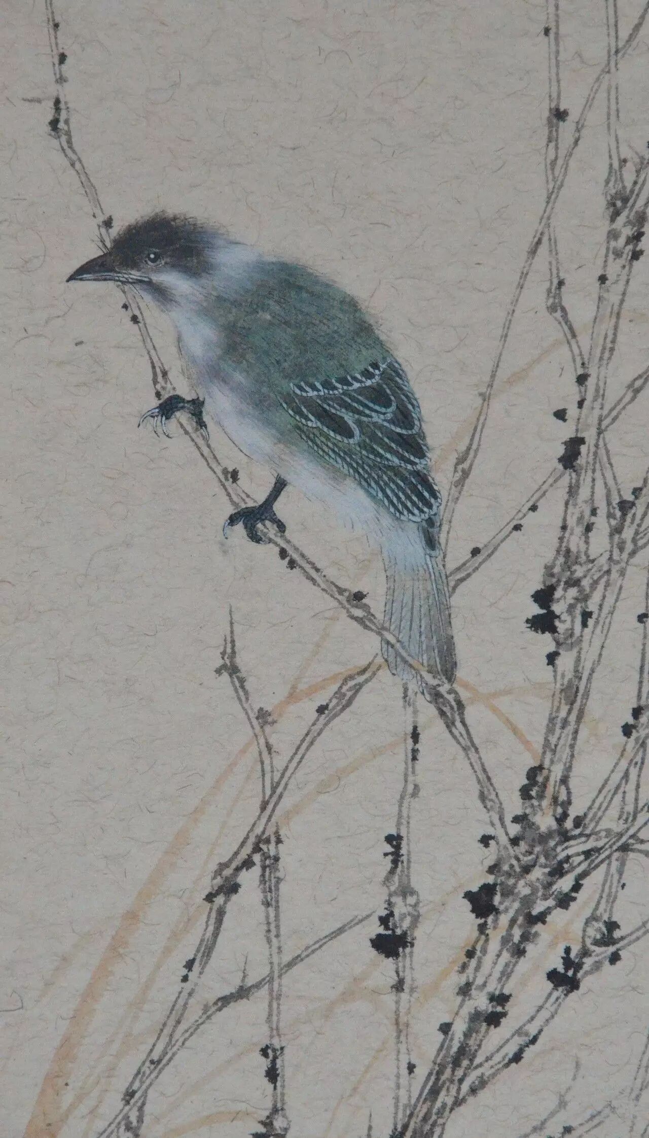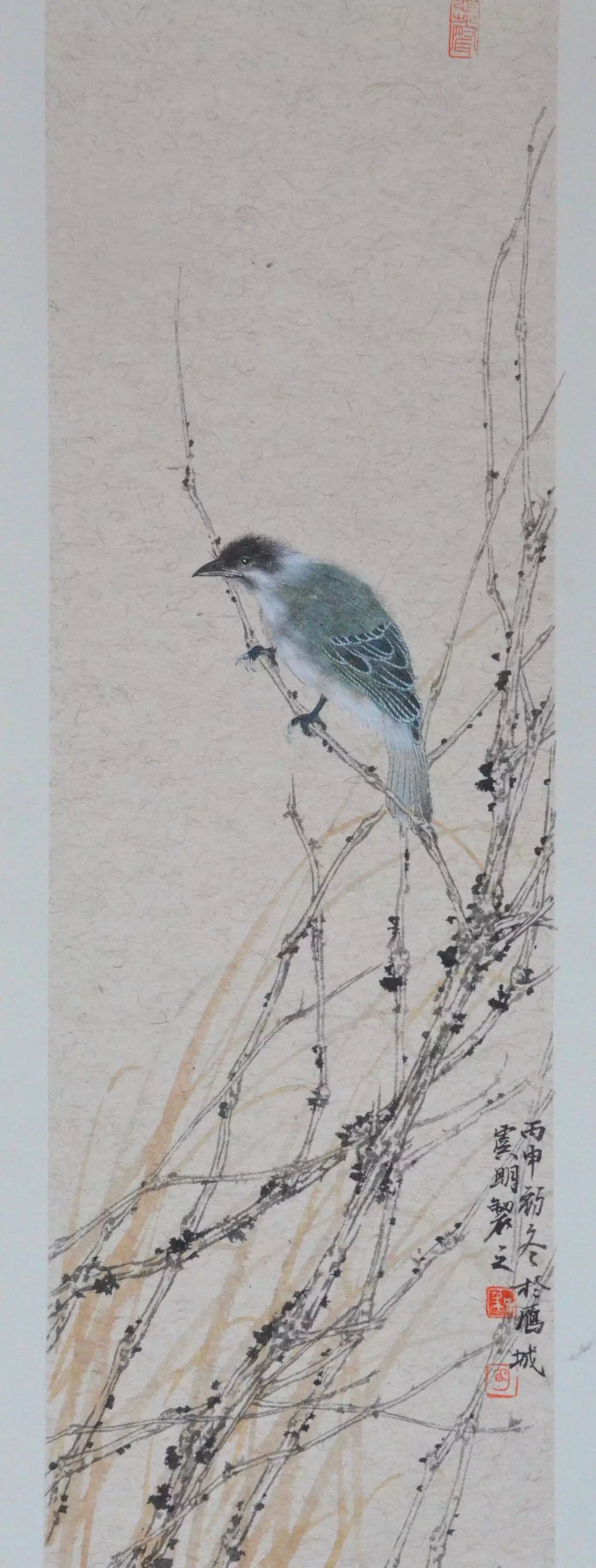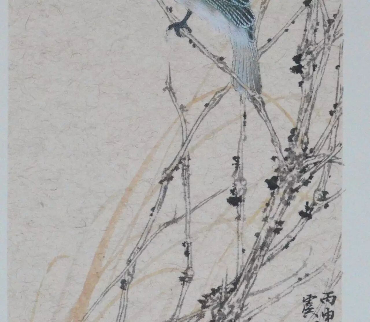 秋雨微寒,最先经受这种清寒的是草木之上停立的鸟雀。和现在的天气一样,雨水之后,清寒寂寂,长日无色,风起时可以听到鸟雀喧。虞明的画大多都很有精致的意味,但并没有工匠之气,你看到他画上的一草一木,鸟儿翩飞,扑扇着小小的翅膀,都是活灵活现的,是在无声的纸上世界里寂静地生动着的。这幅画上的鸟儿静静立在枯枝上,羽毛精细,色彩丰富而优美,尤其是清亮的眼神,瑟瑟雨中一粒星亮,将其神采勾画得形神毕肖。整幅画瘦长而将大部分的笔墨看似落在枝叶纸上,唯一一只毛色幽蓝的鸟儿只占据小小的一隅,却足以抓住每一位观者的眼睛,很是动人。“这是一只多美漂亮的鸟儿啊!”观者如此想着,如同这只美丽的鸟儿,虞明的绘画艺术亦是美丽的,有声有色的,是别具一格的动人世界。