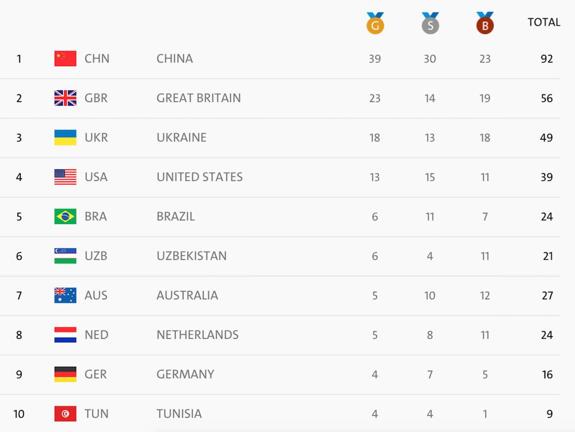 赛程4天,中国体育代表团累计获得39金30银23铜,共92枚奖牌,暂列金牌榜、奖牌榜第一位,创22项世界纪录,奖牌总数比第二名英国整整多出36枚!